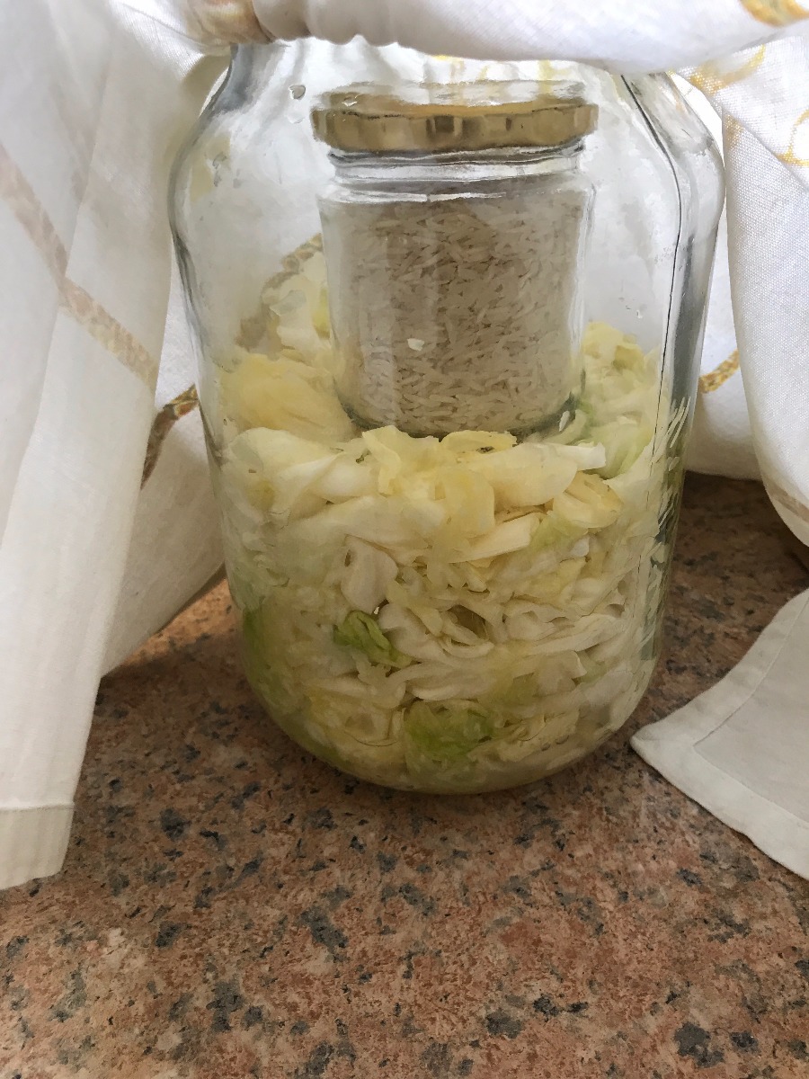 - Full a smaller glass jar with marbles or something heavy and place on top of the cabbage to keep it weighed down.